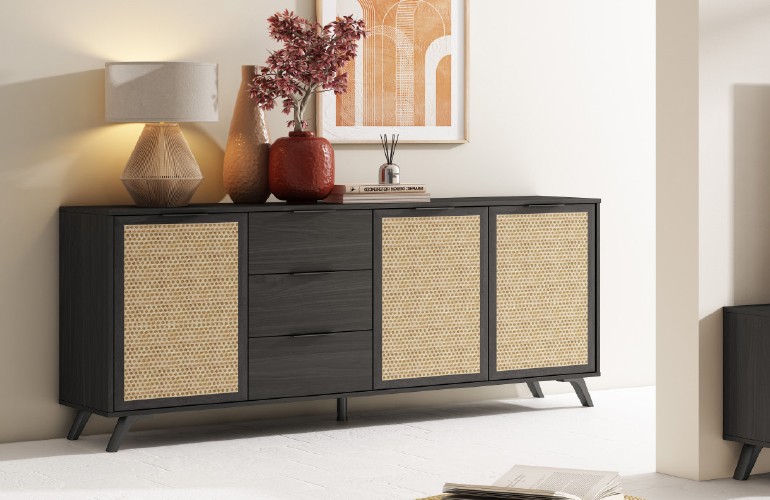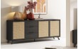 Structure en panneau de particules et acacia + portes en imitation cannage. - Buffet L180 H81 P40 - (Eco. Part. incluse - Buffet : 4.70€ -)