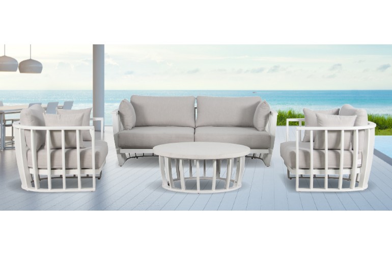 Structure en aluminium blanc + Assise et dossier en tissu résistant. 3pl L205 H85 P90 - Faut L90 H85 P90 - Table L90 H45 (Eco. part. incluse : 12.25€)
