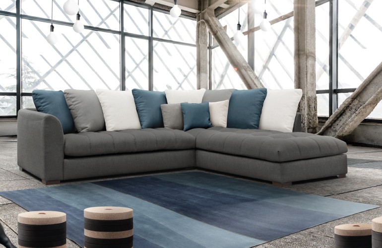 Canapé d’angle Structure en panneau de particules recouvert de mousse en polyuréthane haute densité. Assise et dossier en tissu. Pieds en bois. L285/245 H92 P110. (Eco. Part. incluse : 5.85€)